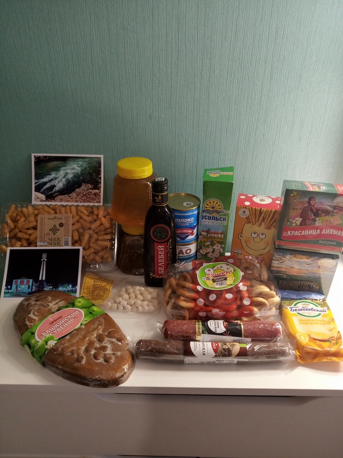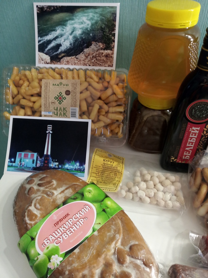 за это разнообразие и разновкусие😊Фиточай двух сортов,Чак-Чак,сгущеночка и кофе, мёд (тоже два сорта),бараночки и соломка,огромный пряник👍,колбаска и даже сыр- всё местное, очень интересно всё это испробовать)Бальзамы двух видов, даже не знаю,как их употреблять😁Но всё вычитаю и обязательно попробую 😉И вот срочно надо загуглить,что такое Курут,никогда даже не слышала) Ещё раз огромное спасибо,фото видов республики Башкортостан получат свои рамочки и займут почётное место😉👍