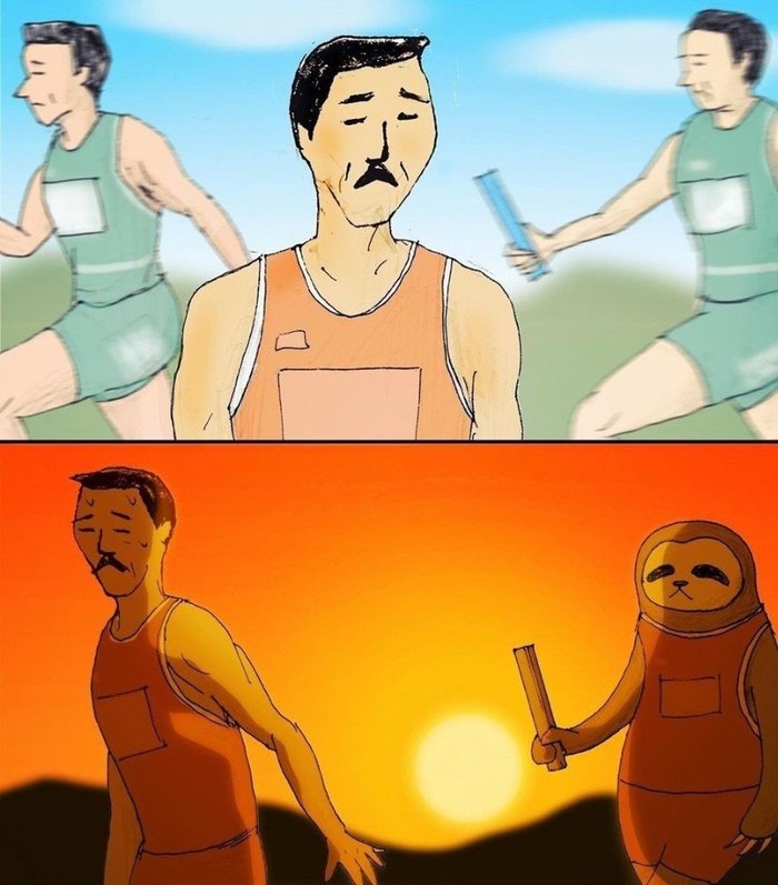 А на станциях бардак полный, денег нет, работа стоит, на него начальники, что повыше, наезжают. Что делать? Совсем плохо. Открывает первый конверт. Написано: "Вали всё на меня".