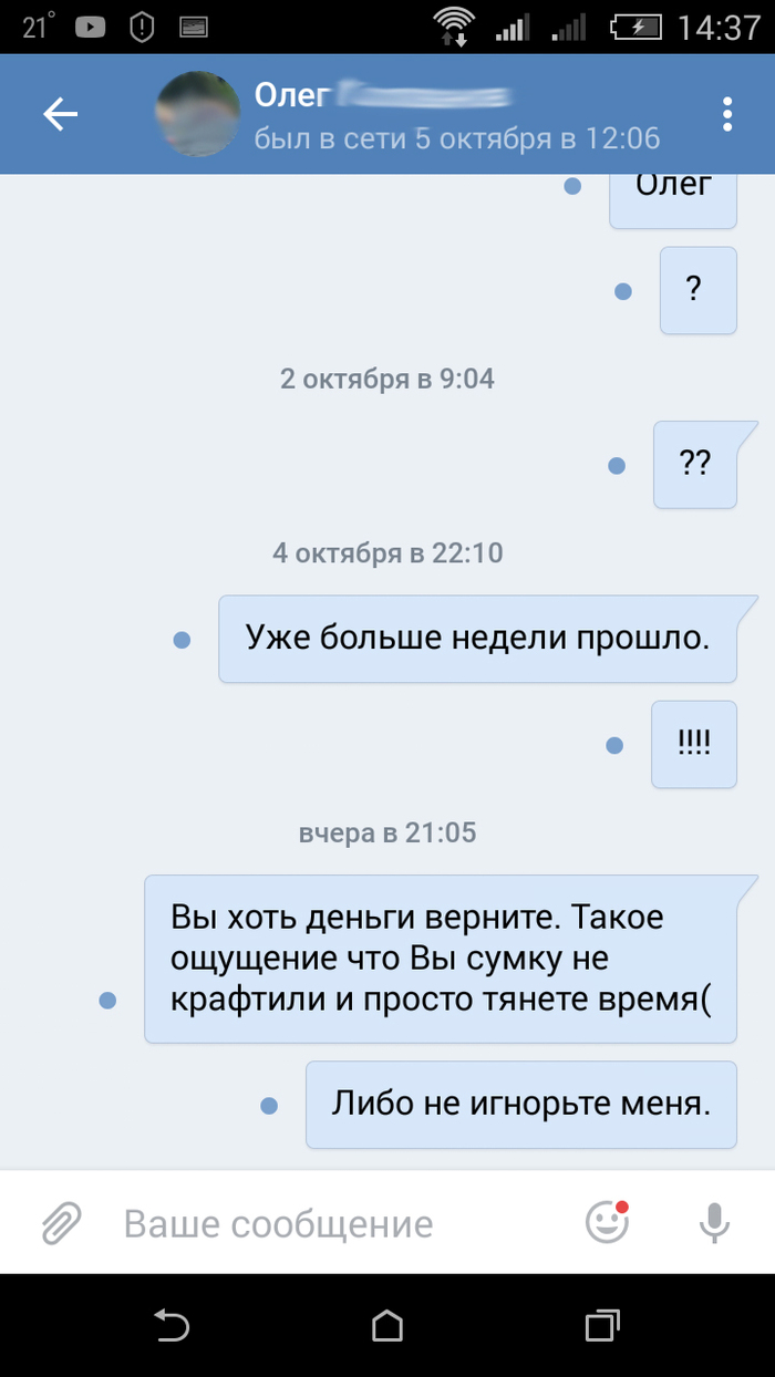 Добрый день. Хотелось бы предостеречь тех, кто как и я захотят заказать у мастера изделия из кожи. Я говорю о @creamcat24. 2 августа я решила заказать мужу в подарок сумку у данного мастера. Нашла его в вконтакте. Мастера зовут Олег. Поверив мошеннику перевела ему оговоренную сумму. Олег не предоставил эскизы, либо фото готового изделия. Сообщил что все готово и "на следующей неделе" он всё отправит. В результате Олег начал меня игнорировать. Это был первый "звоночек". 24 сентября отписался что был занят. И собственно всё. Теперь все мои попытки связаться с ним игнорируются. В вк он перестал заходить в viber он читает сообщения и игнорит.