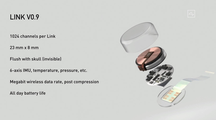 Для связи с окружающей средой используется BLE (Технология Блютуз с высокой энергоэффективностью), сам чип связан с нервной системой нейроинтерфейсом на основе игл(?)