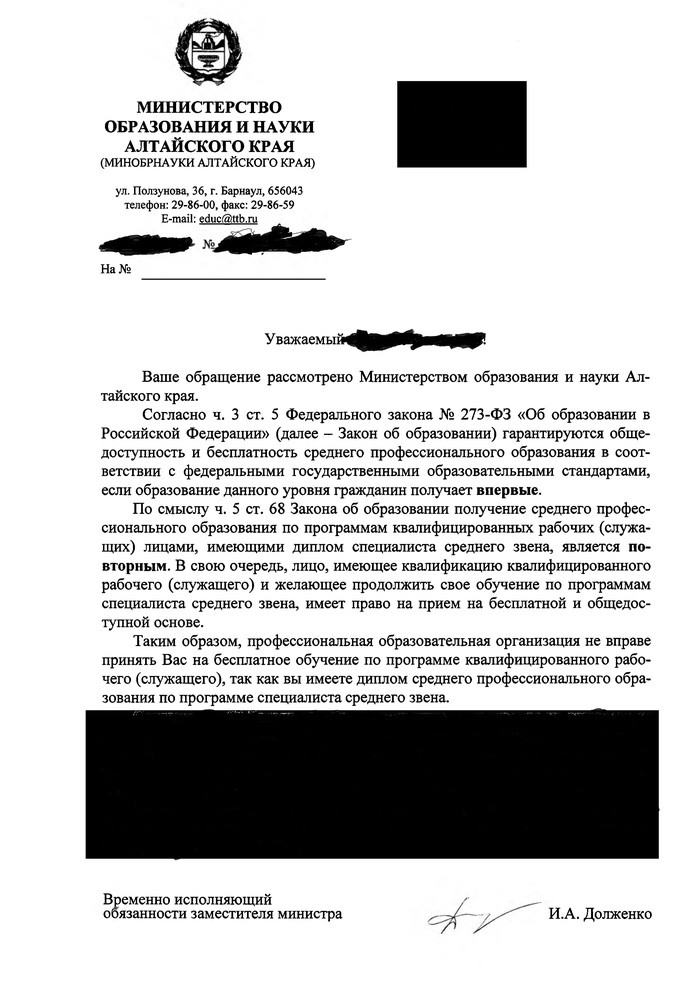 Всем доброго времени суток, камрады! Ситуация следующая - задумался я тут о том, чтобы род занятий сменить от слова совсем. Полистал учебные учреждения, не нашел там начального профессионального образования и начал ковырять законодательство. Оказалось, что такого образования ныне то и нет, а есть среднее профессиональное образование по программам подготовки квалифицированных рабочих (служащих) (кстати интересный момент, что у всех, у кого имеется диплом о начальном профессиональном образовании оно теперь считается средним профессиональным). Выше данного уровня идет подготовка специалистов среднего звена (собственно у меня в настоящее время такой дипломчик и лежит) и если ранее можно было получить бесплатно начальное профессиональное образование при наличии средне-специального, то теперь по мнению разных людей по разному. От некоторых слышал, что так же можно, от некоторых - что нет. Ну вот, собственно, подползаю к сути - написал обращение в министерство образования Алтайского края и пришел оттуда вот такой вот ответ (вторая половина письма ко мне отношения не имеет, потому закрасил):