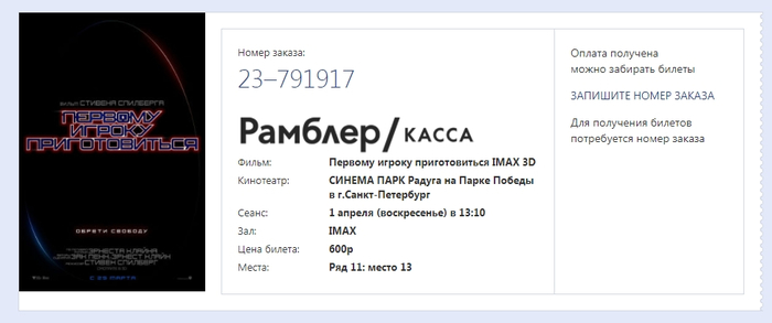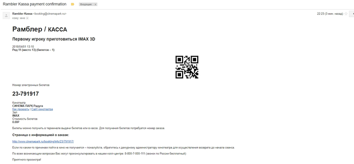 Немного пояснений по скринам. В четверг я с женой собрался на Первого игрока, купил 2 билета в кинотеатр Челябинска, вон они за 900р. Начислили 495 баллов за покупку, стало 683 балла. Буквально час назад на почту приходит письмо на почту с оповещением о покупке, которую я сделал. Вон он, за 600 баллов, на фильм в воскресенье. Вот только билет в кинотеатр в Санкт-Петербурге, за 2500км от меня.