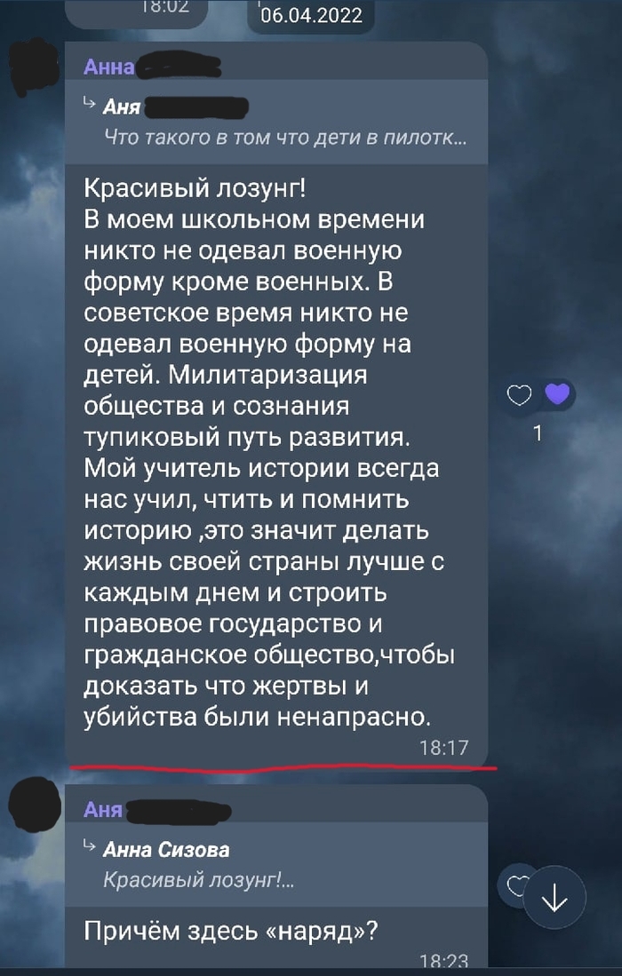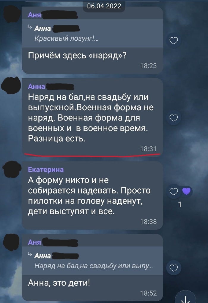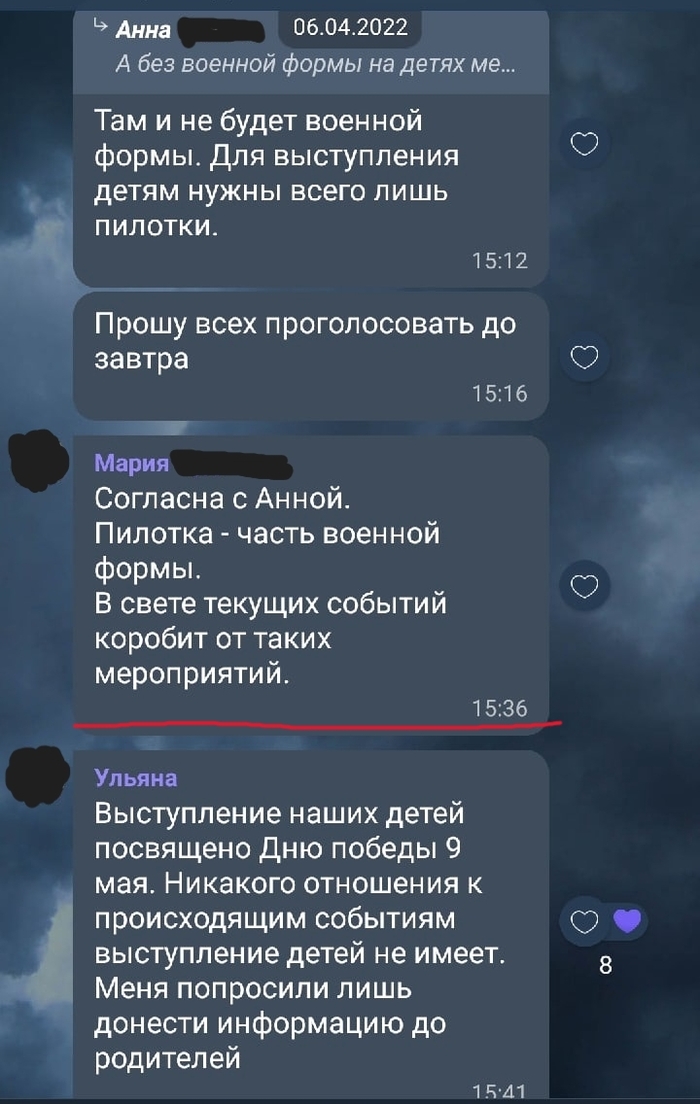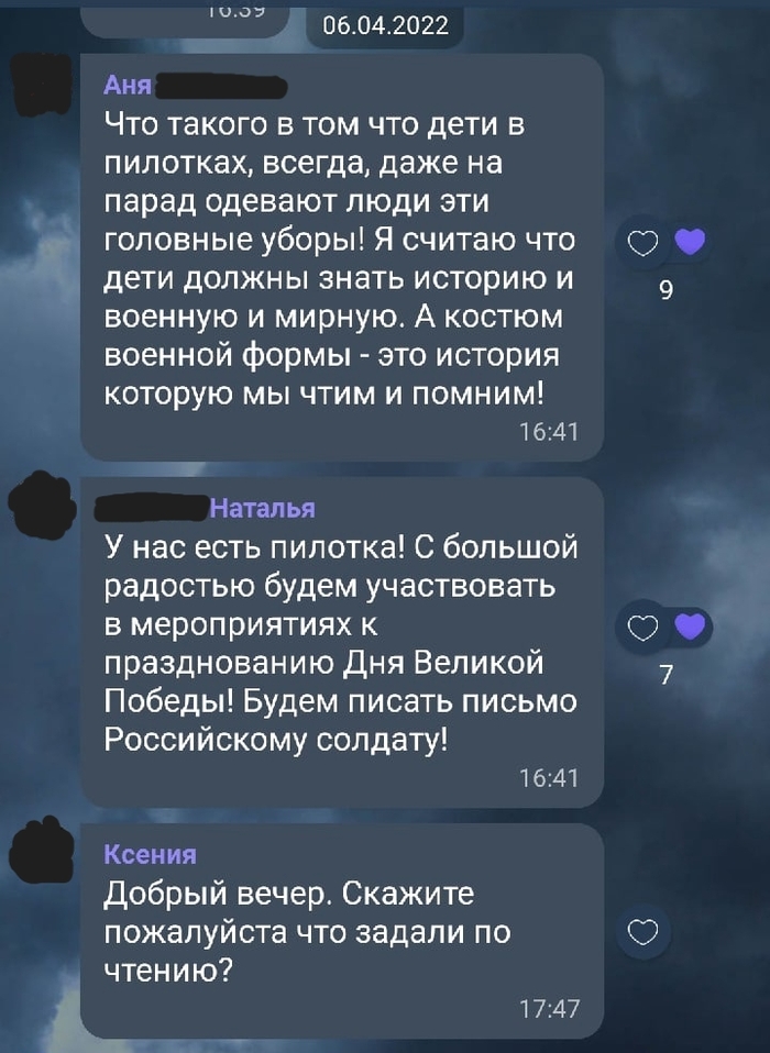 Всегда про неадекватов в родительских чатах я читал на пикабу. Ребёнок заканчивает 1-й класс и я уж думал что миновала меня необходимость общения с идиотами и яжематерями. Но внезапно в обсуждении мероприятий на 9-е мая встал вопрос о пилотках. Атрибуте милитаризации и военщины. Далее скриншоты чата.