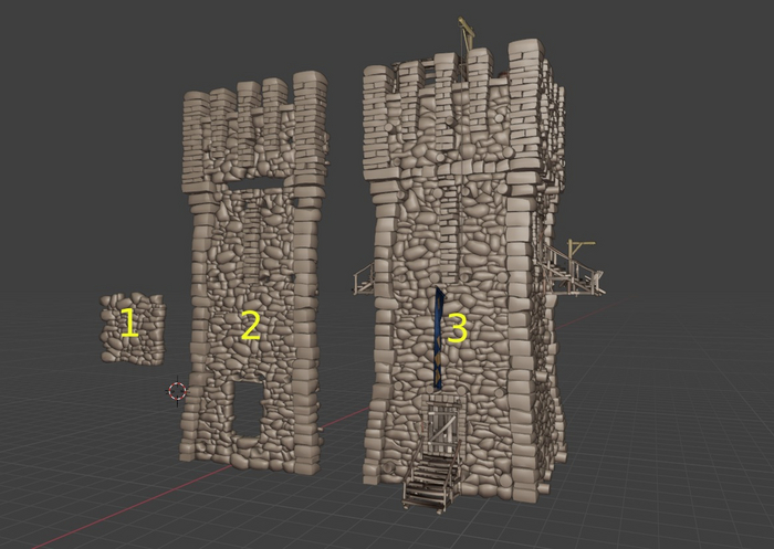 Создаем небольшой кусок стены из отдельных притертых боксов — делаем границы куска взаимостыкуемыми с небольшим зазором (1). Копипастим кусок формируя фронтальную часть башни (2). Формируем зубья и выступы также из боксов ,немного детализируем бревнами и кантом. Копипастим фронтальную часть стены на оставшиеся стороны (3). Стараемся избегать пересечения камней между собой — всегда оставляем небольшой зазор, иначе камни разлетятся в самом начале симуляции. Добавляем интерьерные детали по вкусу- они будут формировать мусор.