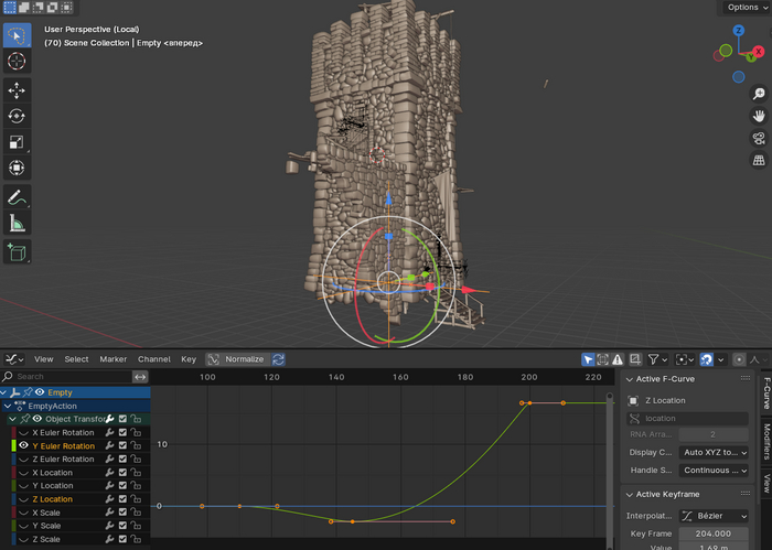 Задача: Разрушить в Блендере 3D средневековую каменную башню частично замедлив ее падение на камеру. На видео https://youtu.be/5plVv_CU-wo (0:33) можно посмотреть результат падения и откуда идет импульс разрушения.