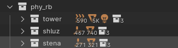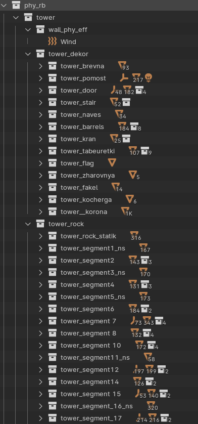 Я понимаю что современного цемента на момент раннего средневековья не было, но разрушение башни через промежуточные сегменты смотрится более эффектно. Поэтому давайте сначала разобьем нашу группу камней на эти сегменты, количество сегментов выберете на свой вкус. Создадим в коллекции phy_rb подколлекции для каждого сегмента, я дополнительно разделил подколлекциями башню, шлюз, стены. Для мелкого мусора я создал подколлекции decor: