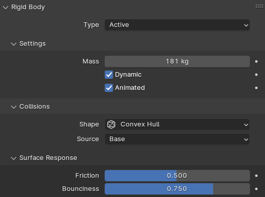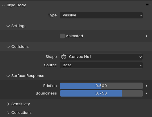 Где Type — тип объекта -пассивный объект не изменяет свое положение, но имеет коллизию с другими объектами, Animated — позволяет передавать управление объектом между системной анимации и системой симуляции, Shape — меш используемый для расчета коллизии объекта: Convex Hull -выпуклая оболочки без учета отверстий (быстрый расчет, но менее точный), Mesh — оболочка эквивалентна форме объекта (медленный расчет, но более точная симуляция) Surface Response это группа отвечает за взаимодействие поверхностей — Friction устанавливает силу трения, а Bounciness упругость. (чем больше упругость тем сильнее обратный импульс силы- отскок)