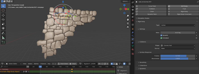 Выделяем все камни всех коллекции сегментов кроме статичной, выбираем меню Object — Rigid body — Add Active. На вкладке физика настраиваем параметры активного объекта: