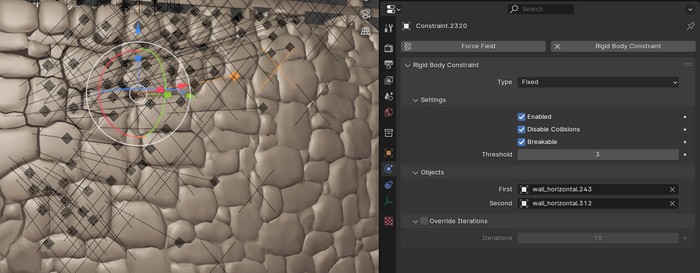 Эти пустышки наш «цемент» и тем он прочнее чем больше значение в Threshold- порога величины силы импульса для разрыва связи. Тип Fixed указывает что соединяемые между собой объекты закреплены жестко без возможности смещений. Отмечу что по умолчанию коллизия между камнями в рамках связи лучше отключить Disable Collisions так будет проще контролировать развал сегмента. Создадим подколлекцию в коллекции сегмента и переместим туда все полученные пустышки. Повторяем для всех сегментов.