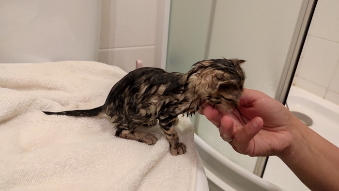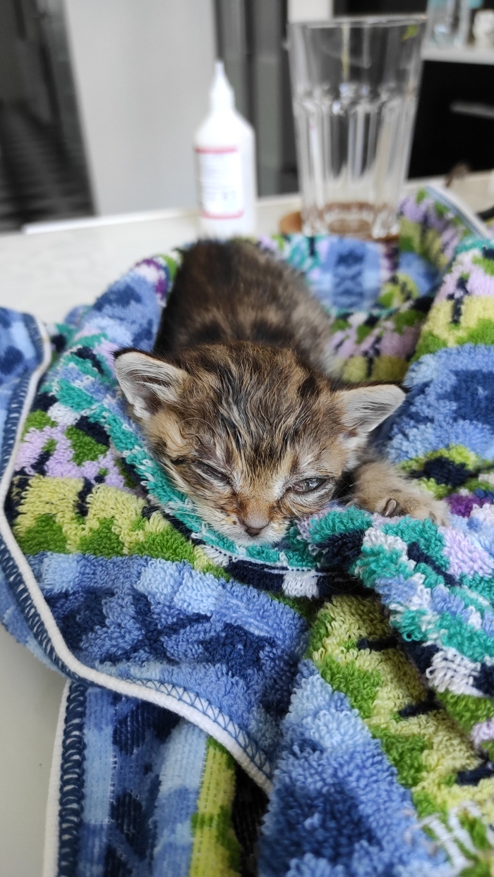У подъезда чуть не наступил на маленький комочек. Двигается, активно мяукает на уколы ветеринара, но очень маленький и больной. Один глаз заплыл, второй пытаемся спасти. Дома три собаки, оставить не можем. Если есть кто то, кто возьмёт его себе, поможем материально. Севастополь, возле центрального рынка.