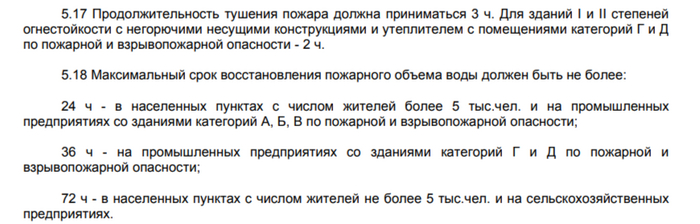 Как мы видим водопроводная сеть крупного города должна выдержать 5 крупных пожаров одновременно. Для мегаполисов типа Москвы это скорее не актуально, предполагаю что там город имеет зональное водоснабжение и водопровод может справится с большим количеством пожаров.