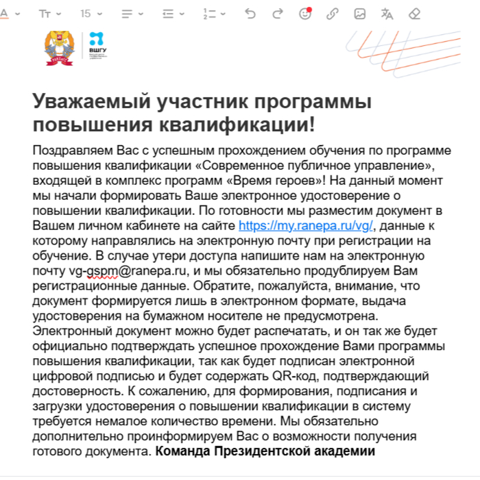 Ну в общем сдав тесты пришлось подождать несколько месяцев пока подведут общие итоги. Мои результаты оказались ожидаемо средними, поэтому предложили пройти обучение по дополнительной профессиональной программе "Современное публичное управление" в 72 часа на базе РАНХИГС.