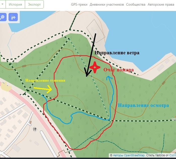 Логично предполагаем, что пожар гонит ветром, причем ветер уже несколько часов не менял направления. Значит очаг надо искать с подветренной стороны, но не в самом начале зоны горения. Несмотря на ветер пожар будет распространяться во все стороны.