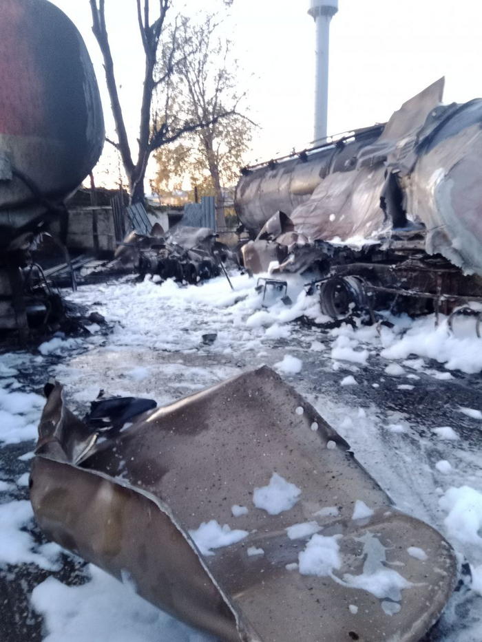 Обстановка на пожаре на этот момент примерно такая. Выгорело три цистерны, повреждено ещё две. Поскольку цистерны стояли практически вплотную их остатки практически перемешались. В этой мешанине разобраться непросто, вдобавок стремительно темнеет.