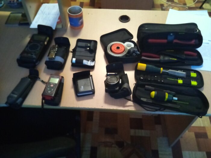 В нижнем ряду - пирометр, лазерная рулетка, стекло для раскатки краски, фотоаппарат, набор инструментов №1 (все что на фото).