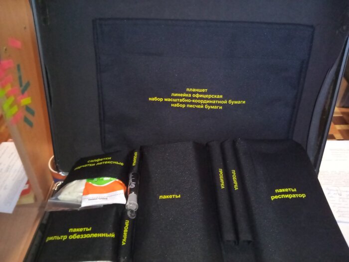 В верхнем ряду - мультиметр, диктофон, ролик и краска для снятия отпечатков, набор ограждающих лент и налобный фонарик, упаковка с инструментами №2 (плоскогубцы, бокорезы, молоток, небольшой совочек, пилка и перчатки)