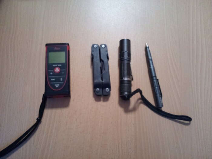 С собой вожу дальномер из чемодана, мультитул leatherman super tool 300, который, собственно и заменяет большую часть инструментов, хороший фонарик Klarus и металлическую ручку (если что ей можно что-нибудь ковырнуть не сильно отвлекаясь от написания протокола осмотра). Еще иногда вожу бомжеручки - простенькие и дешевые ручки, которые даю всяким маргиналам для подписания объяснений. После некоторых из них ручку в руки брать противно, поэтому отдаю с концами. Ну и конечно же резиновые пожарные сапоги, потому как лазить иногда приходится по залитым водой пепелищам с торчащими гвоздями.