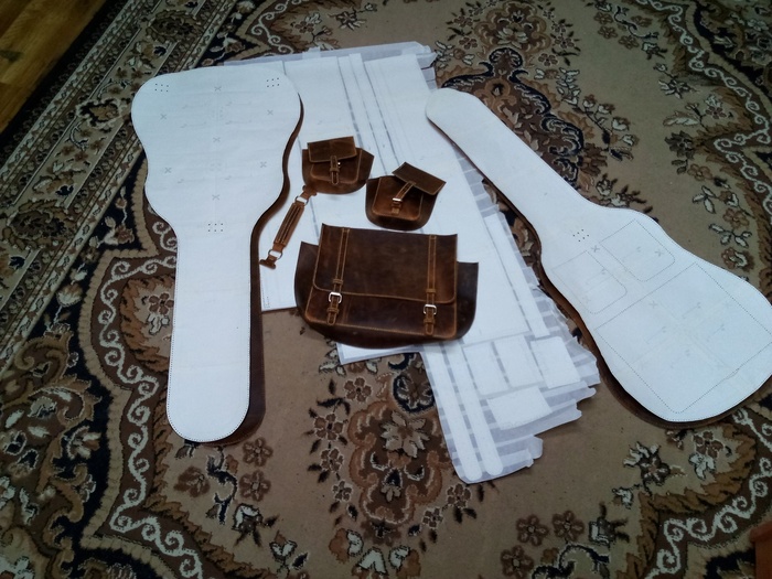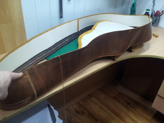 Мой любимый момент, когда остается несколько основных готовых деталей и надо просто сшить их между собой. Правда есть один минус - периметр чехла 2,35м, шаг пробойника 5мм, а это значит что вручную надо сделать немногим меньше 1000 стежков шорным швом в две иглы. В общем пара вечеров