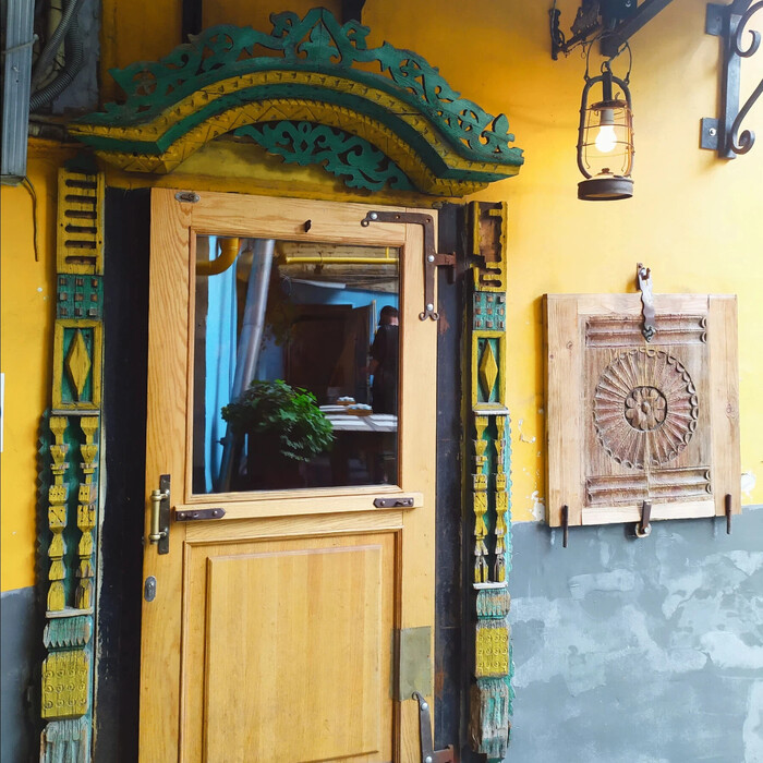 5️⃣ А на этом фото не так примечательна сама дверь, как деревянные кружевные наличники, её обрамляющие. (Ресторан индийской кухни в Ермолаевском переулке)