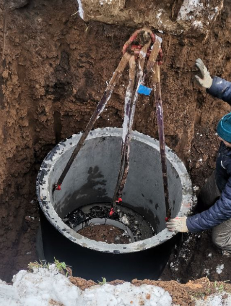 Погода в край испортилась, т.к. пошел мокрый снег, и дренажный колодец ставили под плотной атакой разобранных снеговиков