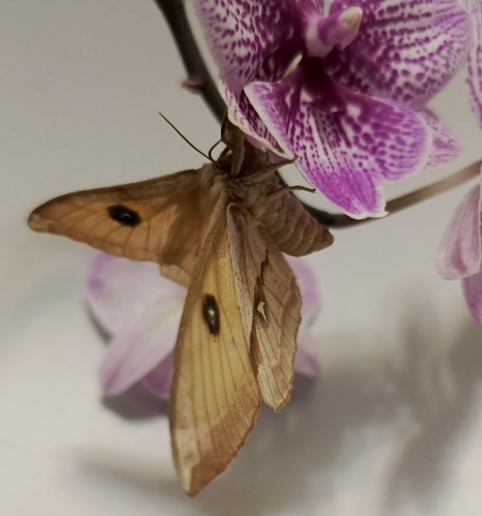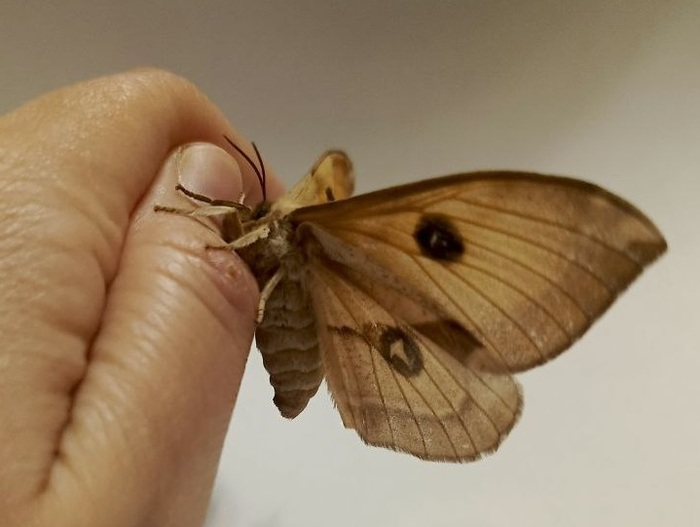 Лето все ближе, температура на улице всё выше, и сегодня я приоткрыла балкон для проветривания. Дело было уже поздним вечером, и на огонёк заглянул Ночной павлиний глаз (Aglia tau). Треща, будто у него вместо крыльев детская вертушка, совершил посадку на люстре. Котяра ну совсем не заинтересовался пришельцем, и чуть ли не лапой у уха крутил, глядя на мою эквилибристику.