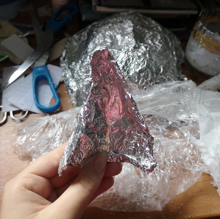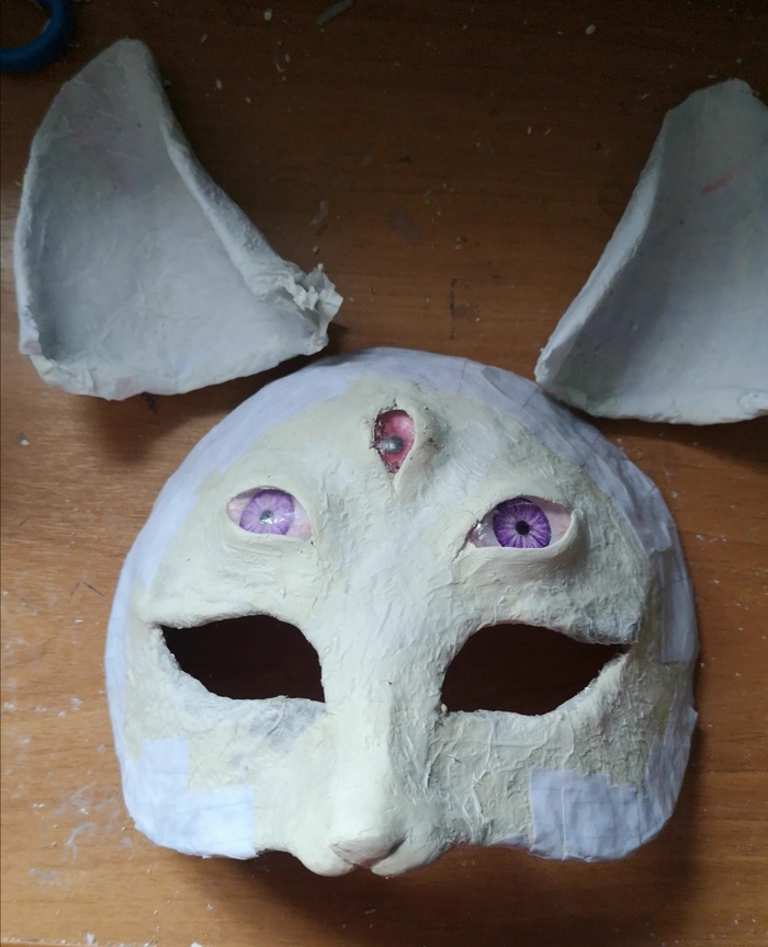 Я сделала глаза : нарисовала их на бумаге, а сверху приклеила стекляшки. А уши сначала я слепила из этой же глины, но при попытке их присоединить к основой маске они сломались, поэтому я сделала форму из фольги, которую потом обклеила папье-маше, и только после того как удалось приклеить их к маске, я доработала их глиной.