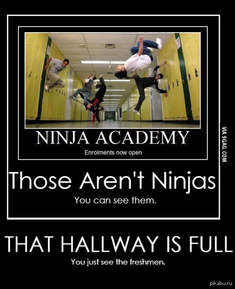 720 BornToWin Академия нинзя 11 лет назад 1. Академия нинзя -день открытых дверей. 2. Они не низя- ты можешь их увидеть 3.Хол полон нинзей, ты видешь только новичков 9GAG Ниндзя