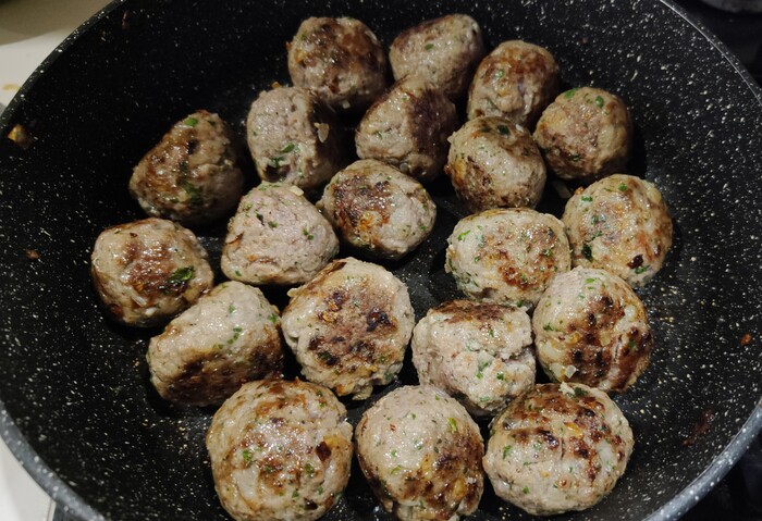 Всё делается на одной сковородке, но возможны вариации: для ленивых и нет. Я делал вариант посложнее, но тут уж сами смотрите. Рецепт прост и займет от силы полчаса времени, хотя оно сильно зависит от скорости катания мясных шариков…