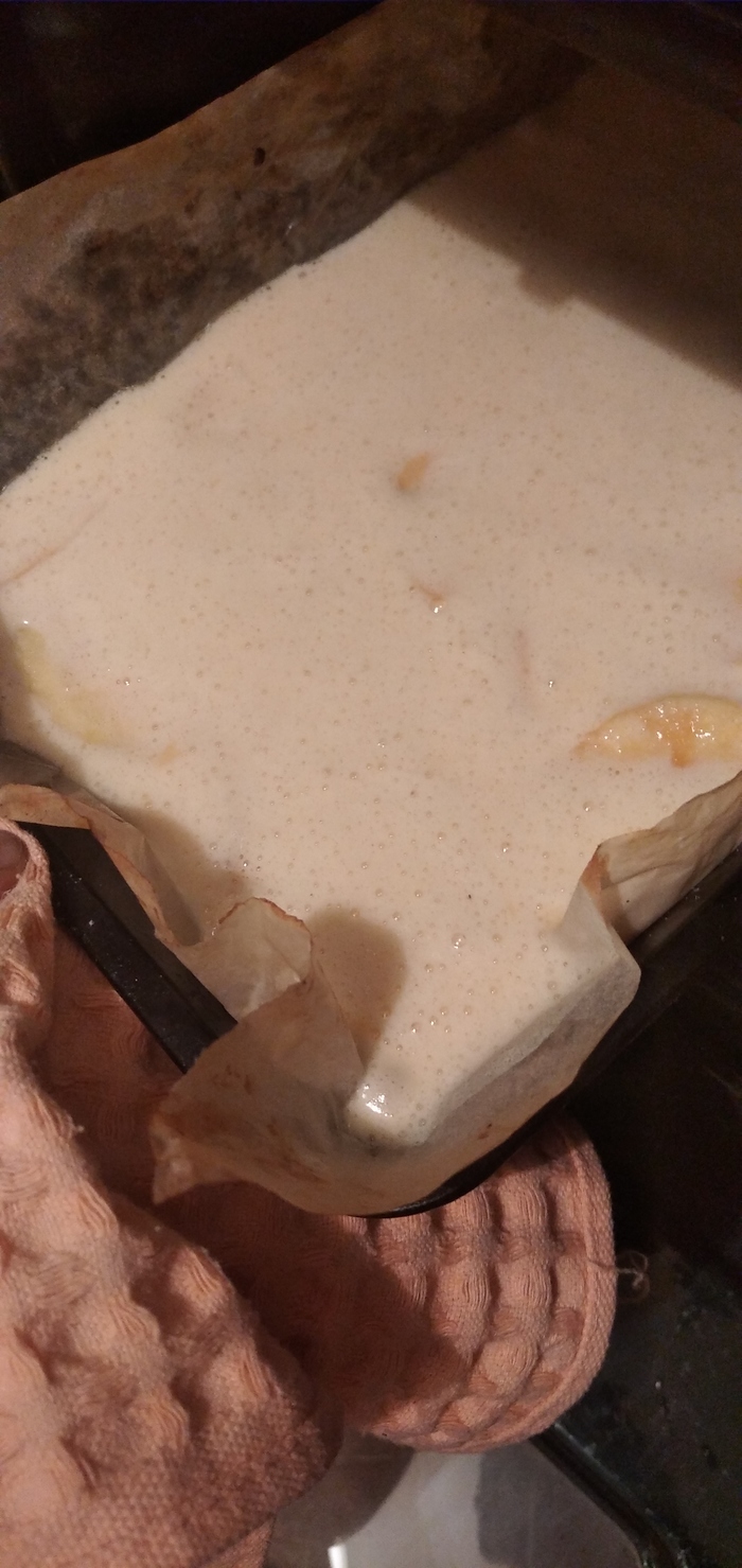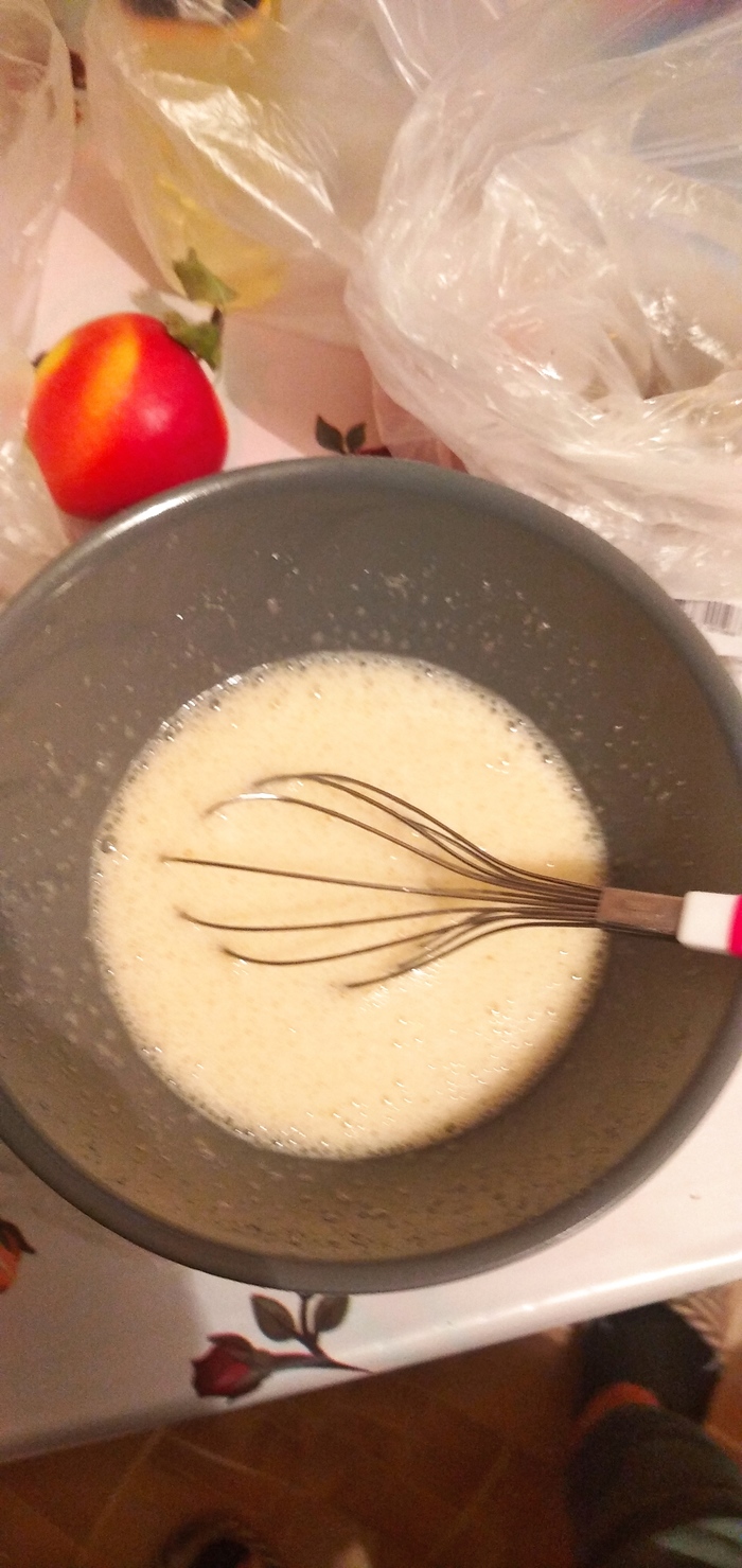 Тесто. В 4 яйца всыпаем 3/4 ст. сахара и взбиваем венчиком до состояния чтобы растворился сахар и масса слегка побелела. Взбивал венчиком, в идеале миксер, но у меня его нет. Добавил ванильный сахар и разрыхлитель. Муку 3/4 стакана высыпал одновременно помешивая. Размешал до состояния сметаны. Заливаем в противень и выкладываем сверху яблоки и и ложкой чуть притапливаем.
