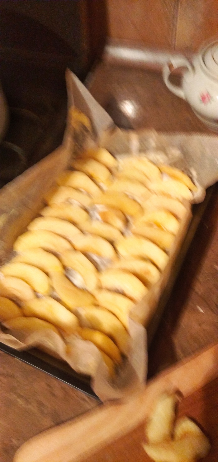 Застилает пергаментом, намазывает бумагу маргарином и присылаем слегка мукой. Нарезанные кусочки яблок делим примерно поровну. Одну половину выкладываем в противень на бумагу.