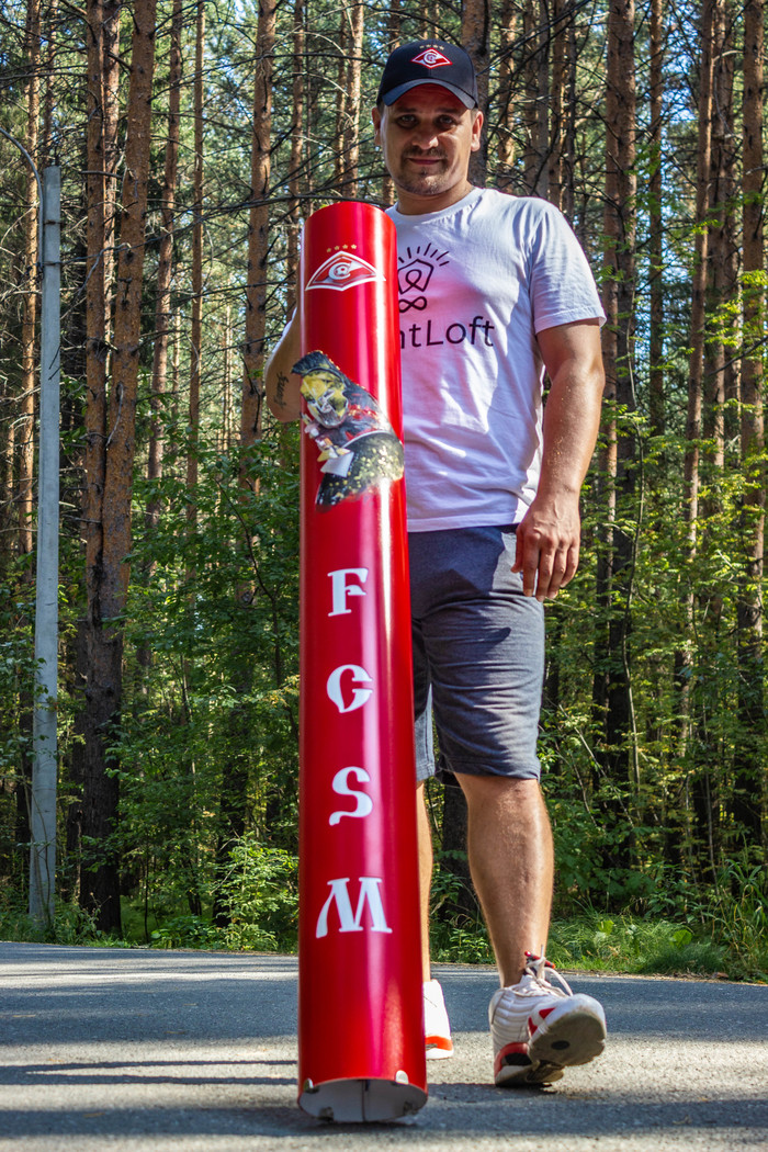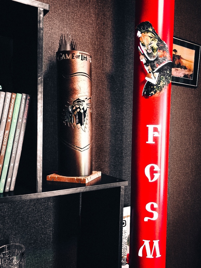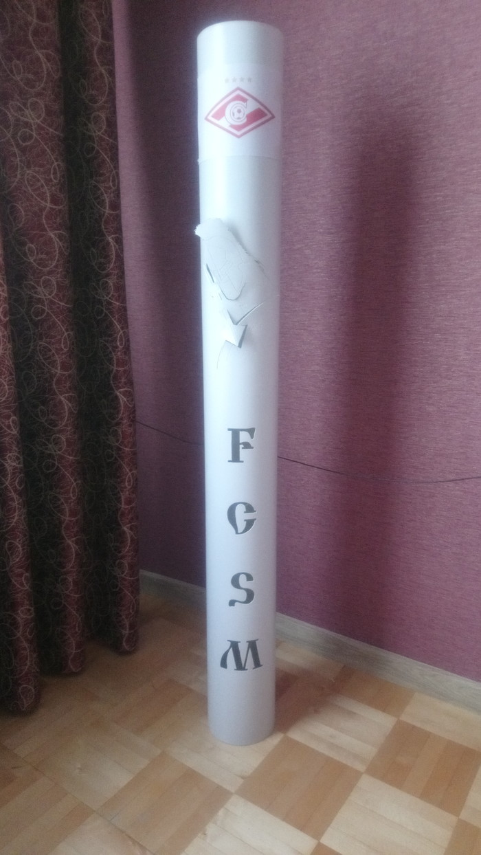 Пвх труба диаметром 160. Внутри пэд с плёнкой Oracal, неоновая лента белая. Гладиатора и FCSM вырезал вручную гравером, раскрас спартанца художественным акрилом, наклейка эмблемы из типографии.