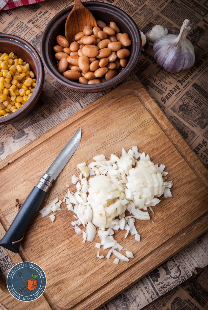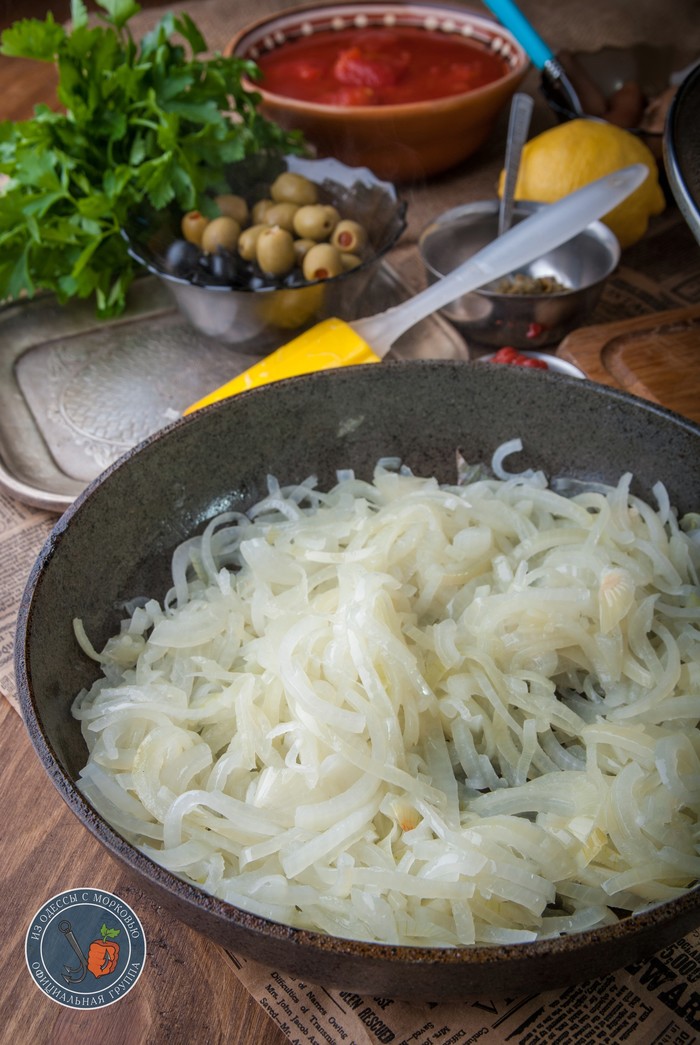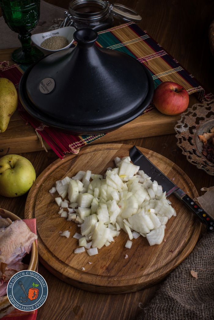 - Лук нарезать кубиком и поджарить на среднем огне в самом тажине, в небольшом количестве растительного масла до золотистого цвета, не забывая помешивать. Если тажина нет- жарьте в сковороде, а потом переложите в форму для запекания.