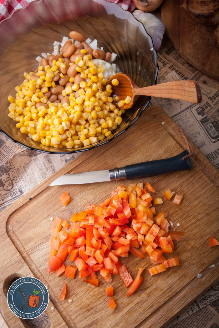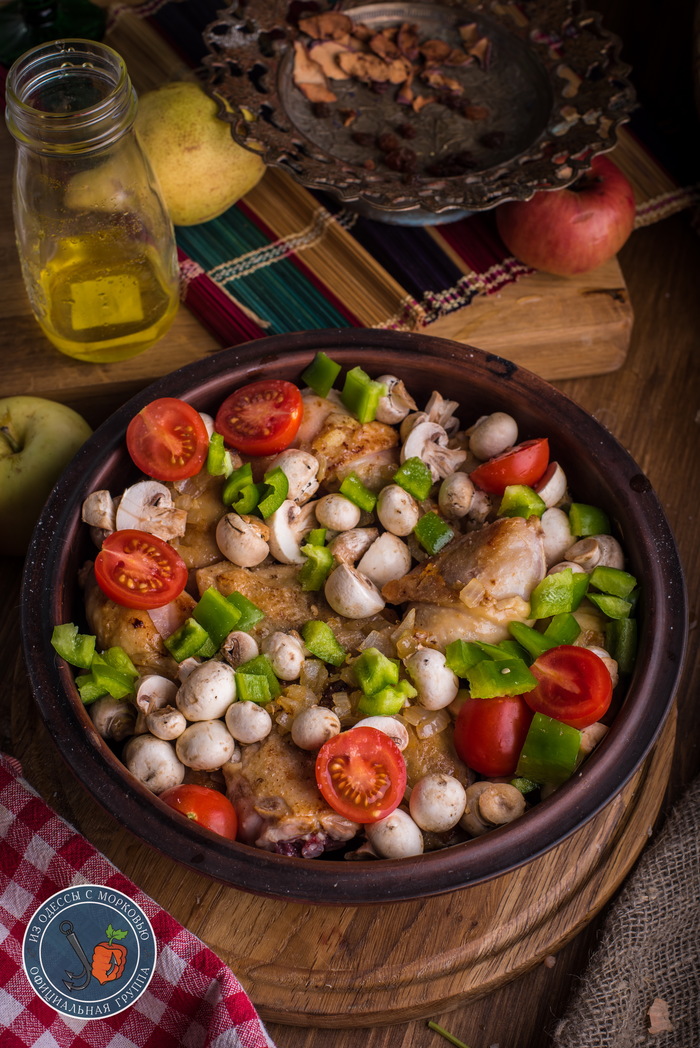 (Курица, сладкий перец, пуговичные, мелкие шампиньоны, черри, лук)