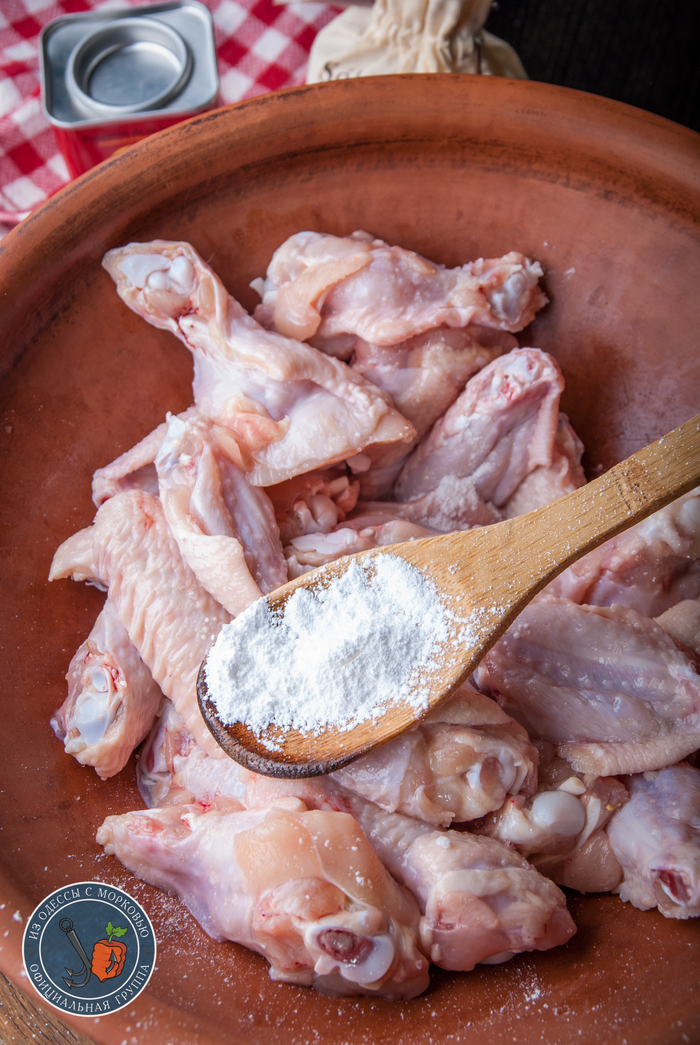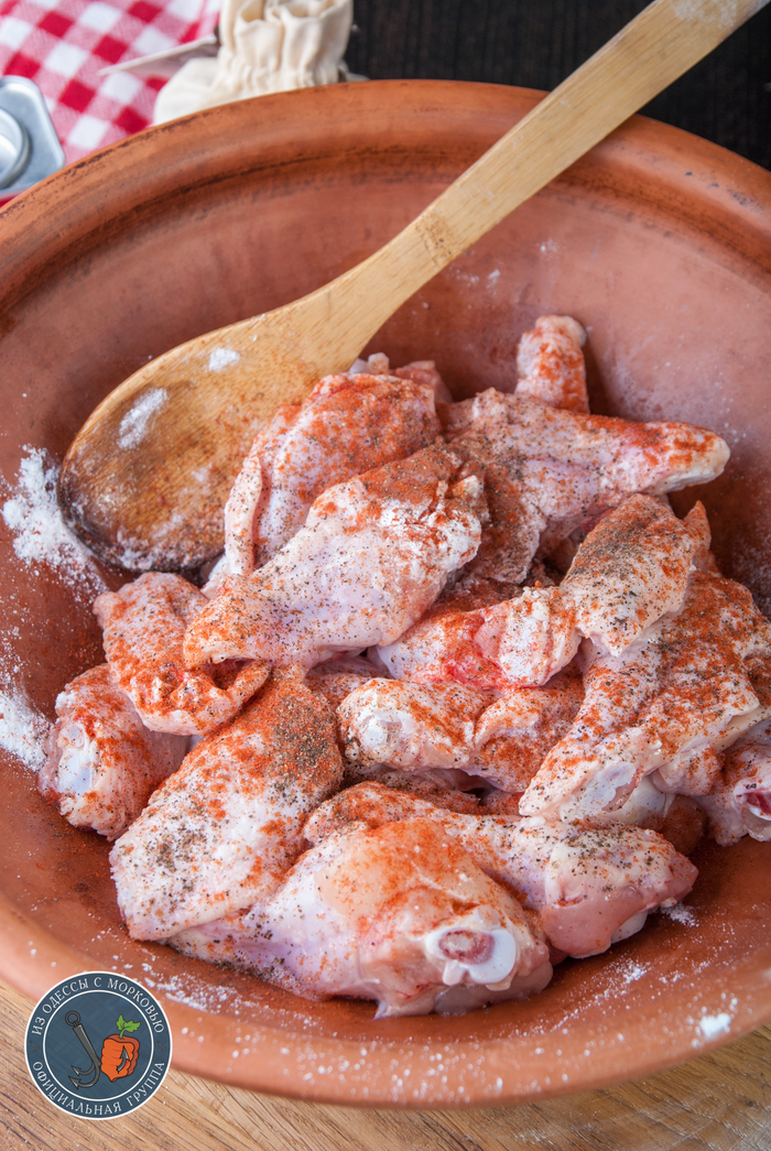 - Курицу разделать на порционные части, примерно одного размера, промокнуть бумажными полотенцами, чтобы не стреляло масло и обжарить до полуготовности с двух сторон.
