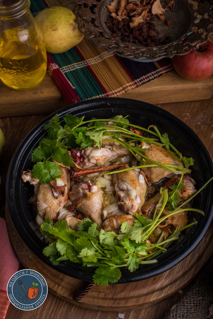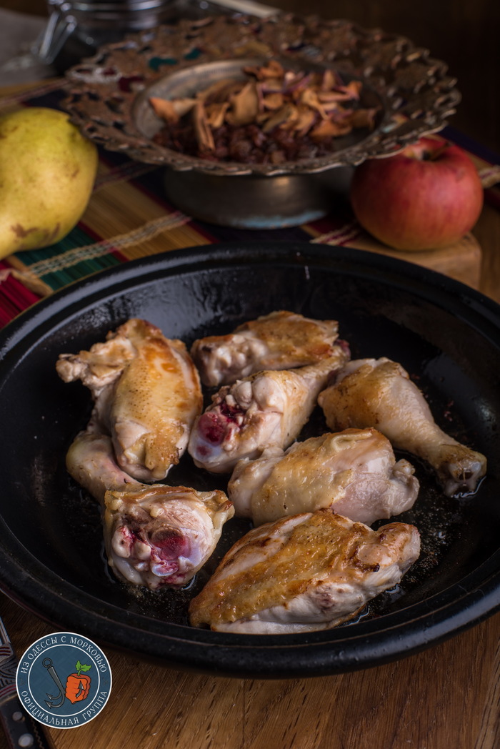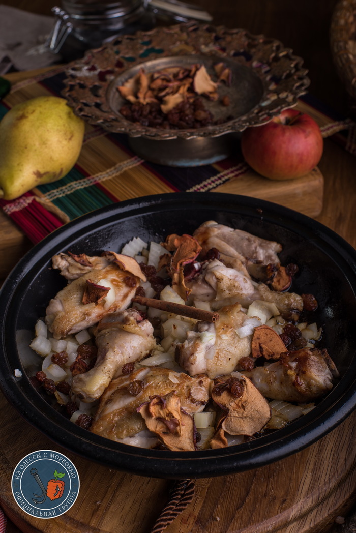 - Переложить курицу и поджаренный лук в форму для запекания или оставить в тажине