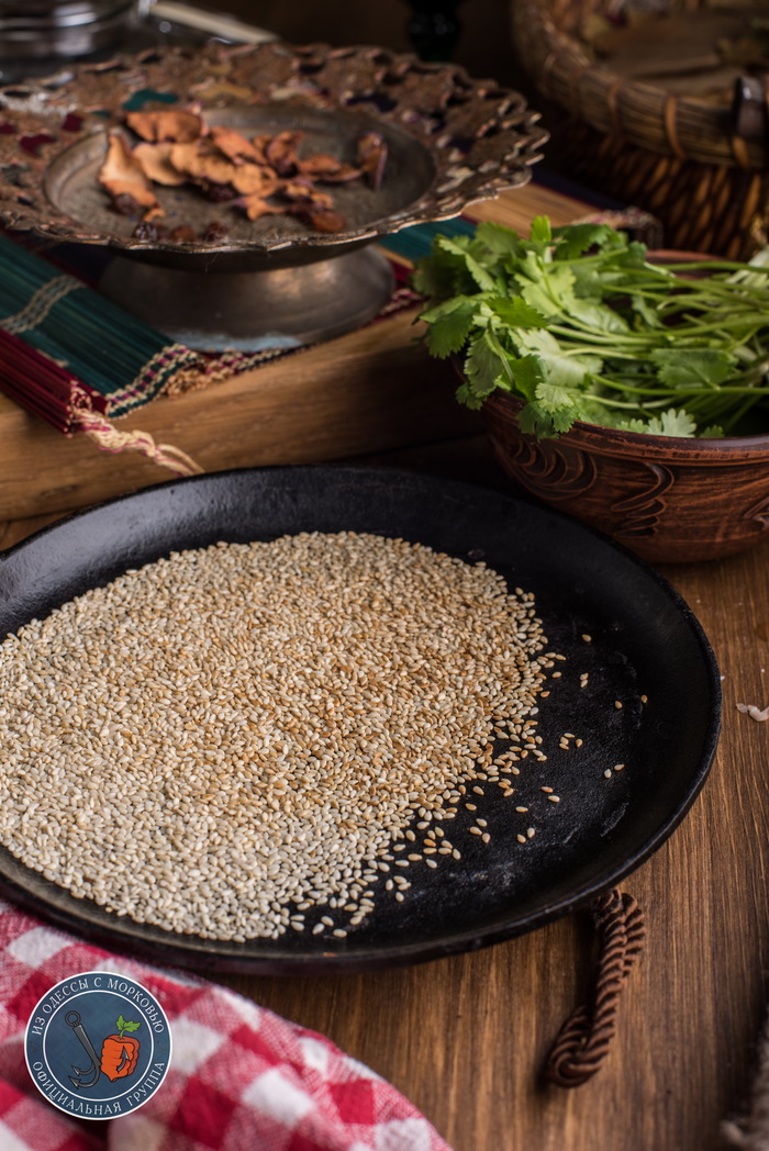 - В отдельной сухой сковороде, на маленьком огне, слегка поджарить кунжут. И не уходить с кухни. Прозеваете- придется переделывать.