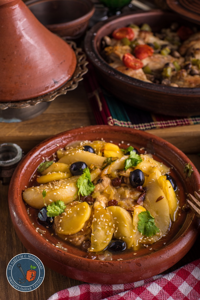Традиционный тажин (а именно так называется любое блюдо, приготовленное в нем) – баранина с сухофруктами, утка или курица с солеными лимонами и оливками, рыба со свежими овощами.