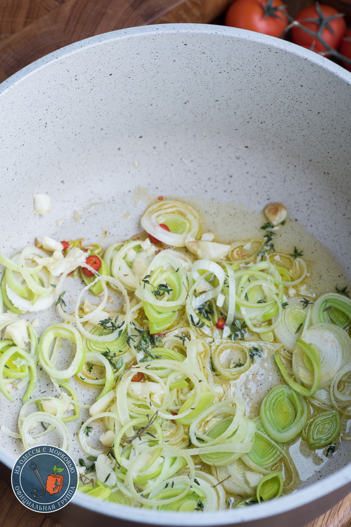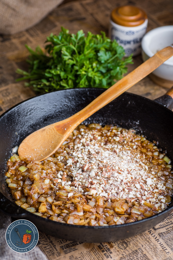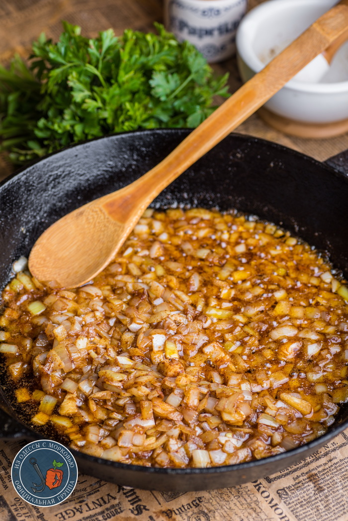 - Разогреть 2ст.л масла и забросить лук. Готовить на среднем огне, помешивая, минут 5.