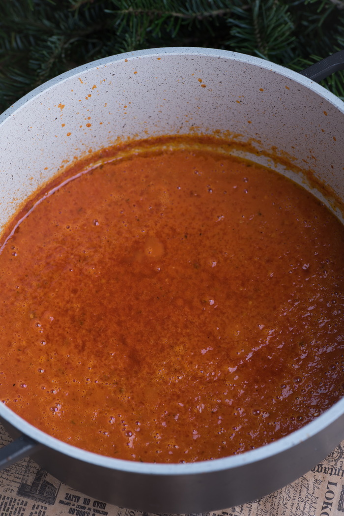 -На этом этапе я снимаю сковороду с огня и прямо в ней перебиваю соус погружным блендером до гладкого, однородного состояния. Но если блендера нет, то можно оставить, как есть.