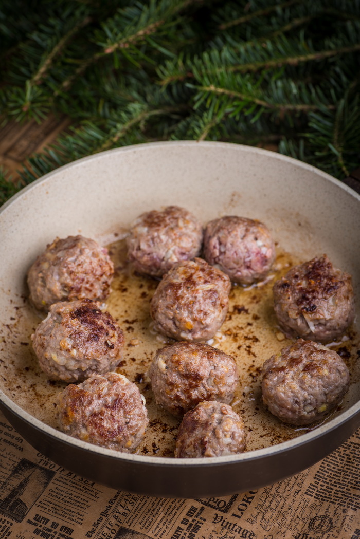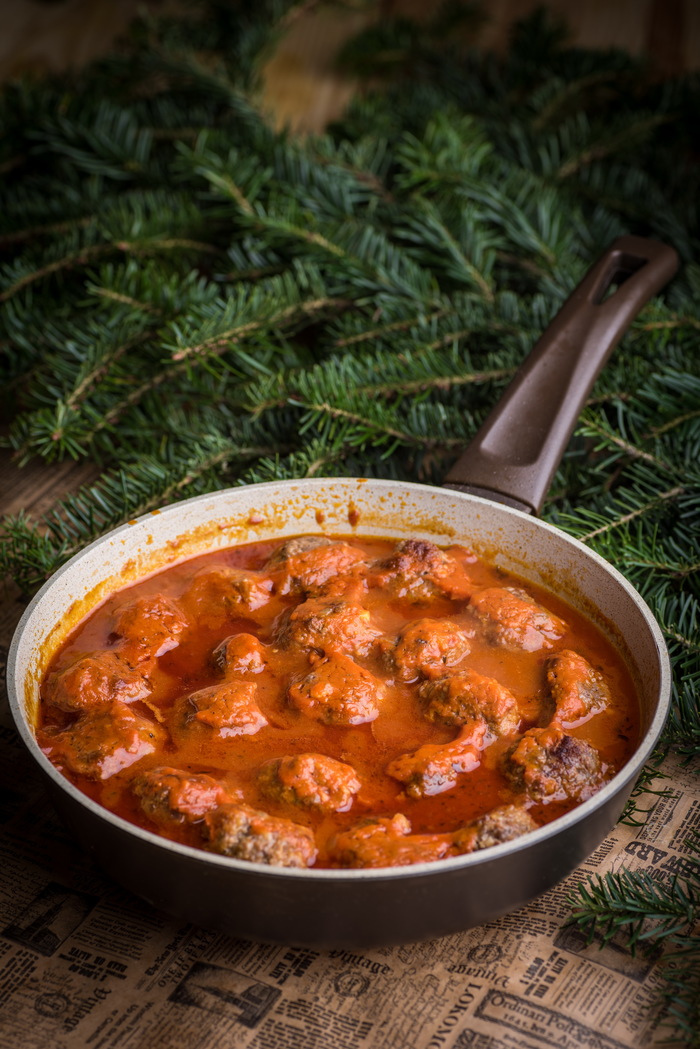 - Сложить все фрикадельки в подходящую по размеру сковороду и залить соусом, чтобы покрыло.