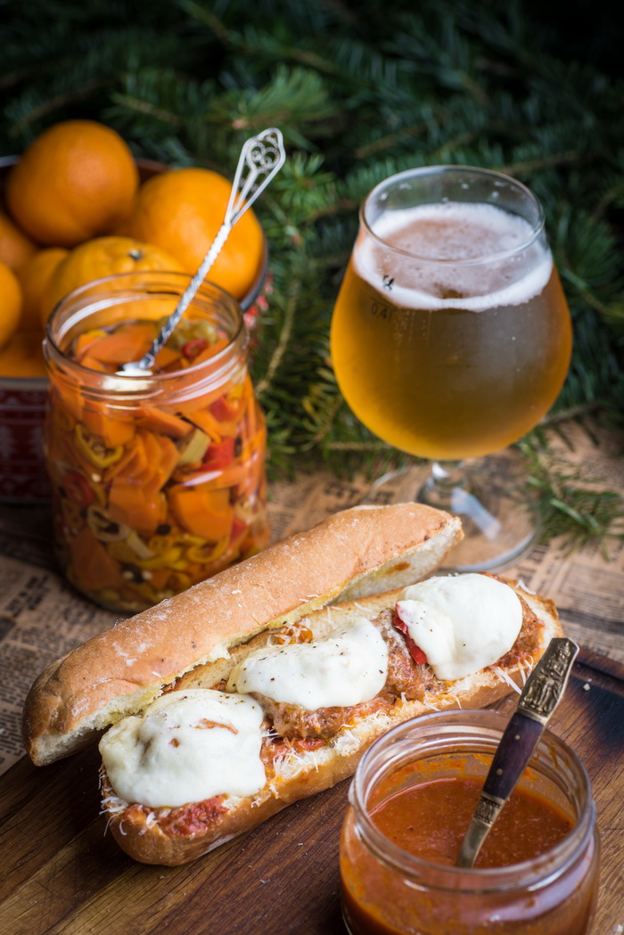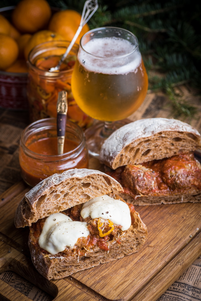 - Теперь сборка: на нижнюю часть булки от души добавить соус, выложить внахлест половинки фрикаделек, сверху я кладу еще свои маринованные чили. Присыпать тертым пармезаном и выложить кружки моцареллы. Поставить в духовку на пару-тройку минут, чтобы расплавился сыр. Подрумянивать не надо. Вот как только сыр потек, доставайте. Все. Теперь накрыть верхней частью булки (ее также подогреть на финальном этапе, но отдельно). Открыть пиво. Наслаждаться.