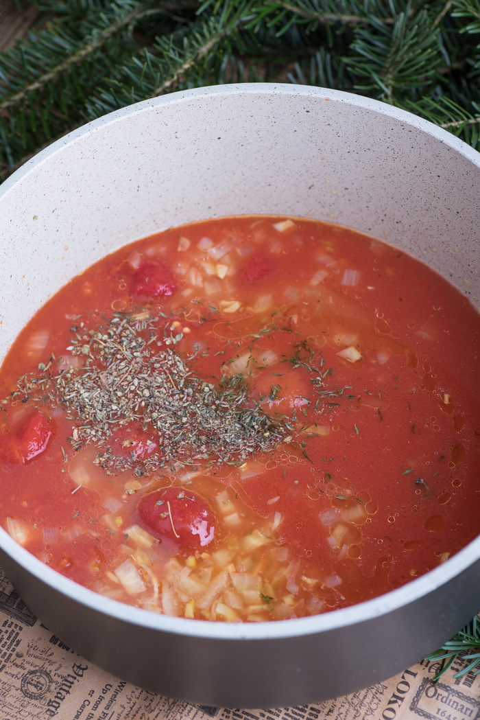 - Если нет под рукой помидор в собственном соку, можно использовать готовый домашний или покупной томатный соус.