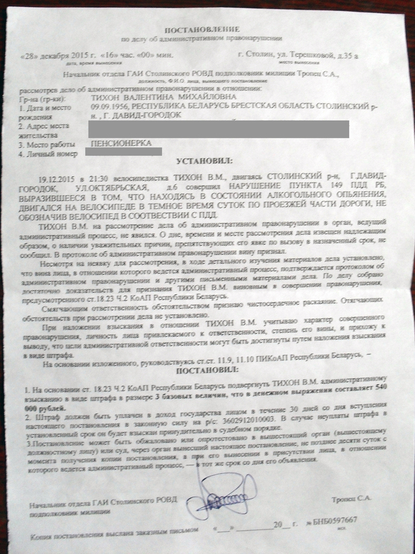 Собственно история: мама была в гостях, засиделась и возвращалась домой, ведя велосипед в руках, по тротуару (на велике спереди белый катафот, сзади - красный, на колесах - оранжевые. самому велику лет 300), заметьте, не ехала на нем. На рукаве намотан фликер. Нагнулась завязать шнурок, и тут из непонятно откуда выбежали доблестные ночные стражи велопорядка и завернули ей руки за спину, напугали, начали предъявлять обвинения, в итоге конфисковали транспортное средство и увезли ее для освидетельствования. Говорит что ничего не подписывала кроме документа, говорящего что ее обследовали на предмет алкогольного опьянения.