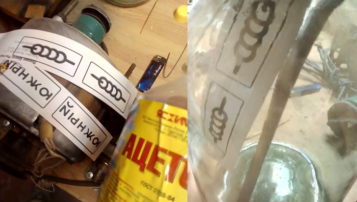 Это будет горячее клеймо. Распечатываю шаблон будущего изделия и помешаем его в пары ацетона, так тонер расплывается устраняя пробелы в печати. И в этом моменте внимательный человек поймет в чем я ошибся.