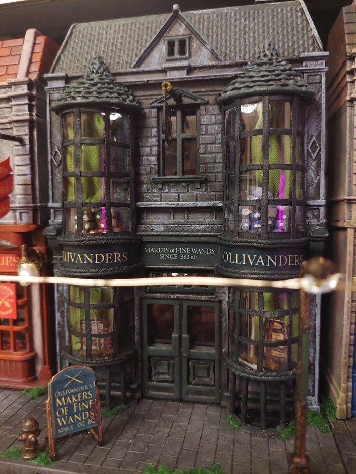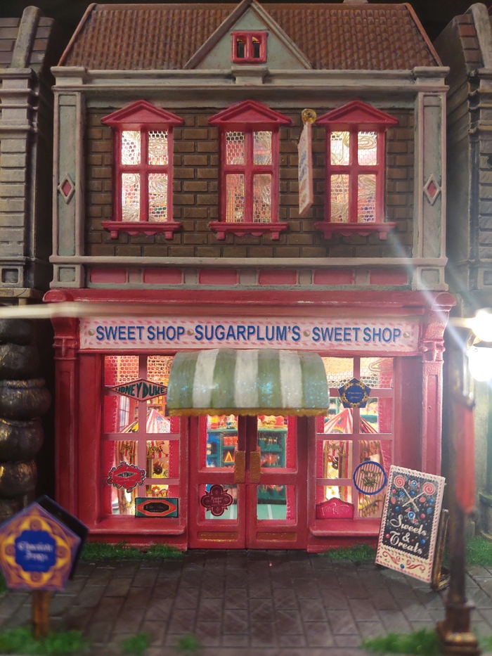 Самым сложным в переделке домиком, была лавка Оливандера. Похожего фасада в наборе не было. Пришлось дорабатывать с помощью картона и пластика. Также мне помог в создании деталей набор пластелина Плей до.