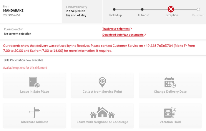 Посылка отправлена через DHL - 2009969651 из Японии. До Германии она добралась, но теперь её статус Ausnahme (Exception). Our records show that delivery was refused by the Receiver - да, в первый раз (23.09) боксбери её не забрали, т.к., возможно, я не успел оплатить пошлину до её прибытия. Но и после оплаты который день посылка: Shipment is on hold.