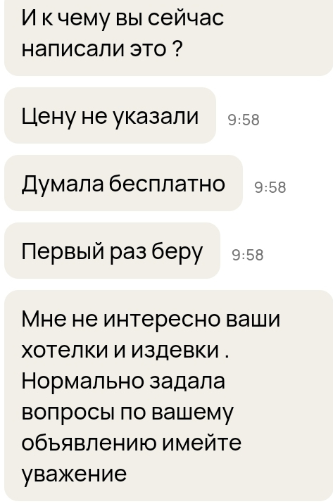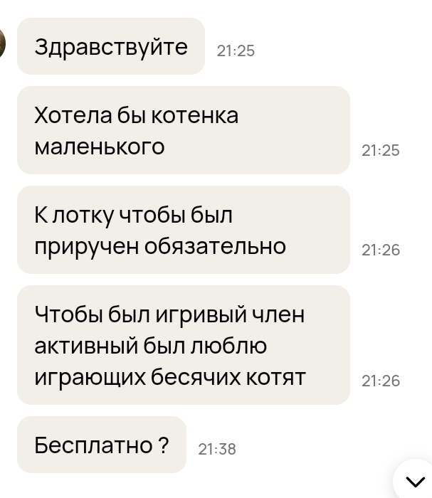 Впервые в жизни разместил объявление о продаже котят на всем известном сайте. Думаю не надо объяснять, что животное с родословной, от титулованных родителей, прошедшее комплекс прививок, требует от заводчика существенных вложений. Конечно наслышан что большинство завсегдатаев xyutо в той или иной степени поехавшие, но не думал что до такой степени. 9 из 10 пытаются выпросить бесплатно, некоторые даже готовы прям щас забрать(хотя в описании русским по белому написаны условия продажи и цена, и что отдаются только через месяц, после прививок, видимо описание не читают). Несколько раз даже требовали привезти немедленно (видимо частично читают, т.к. в описании предусмотрена бесплатная доставка в черте города и окрестности) Но эта любительница игривого члена превзошла всех)))