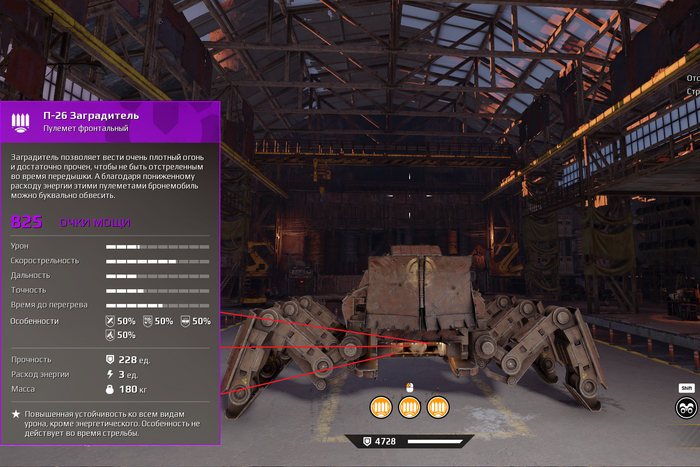 1) Каким бы жирным крафт не получился, вы полезны пока можете стрелять, поэтому оружие должно жить максимально долго. Фронтальные пулеметы позволяют разместить их под брюхом паука, под защитой кабины и лап. Отстреливать оружие можно только самому находясь под огнем.
