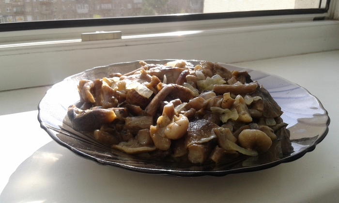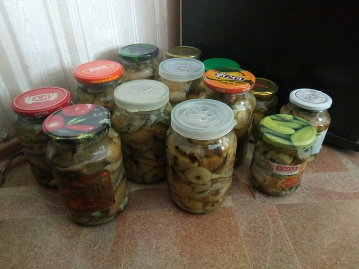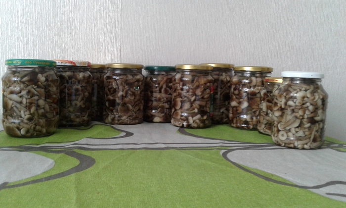 Получилось 4 баночки опят, еще две с груздями, пожарили целую сковороду грибов с картошечкой и отдали мешок зонтиков свекрови, она спец по икре.