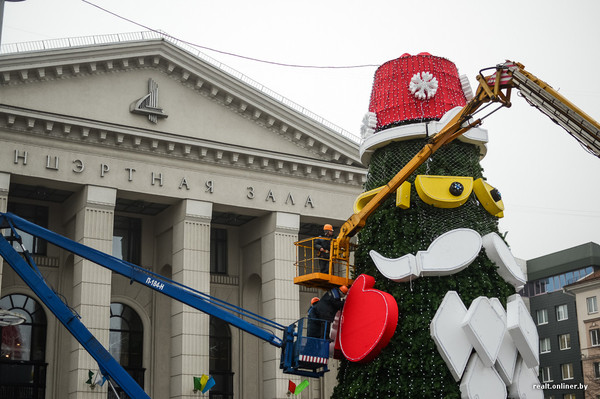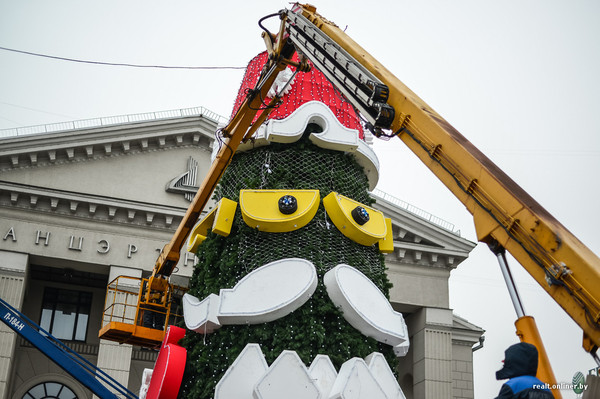 Накануне Нового года столицу снова украсили темно-зелеными конусами, обвитыми гирляндами и шарами. На общем фоне елка напротив Белгосфилармонии удивила минчан оригинальным дизайном — праздничный атрибут решили стилизовать под модного Деда Мороза в желтых очках.